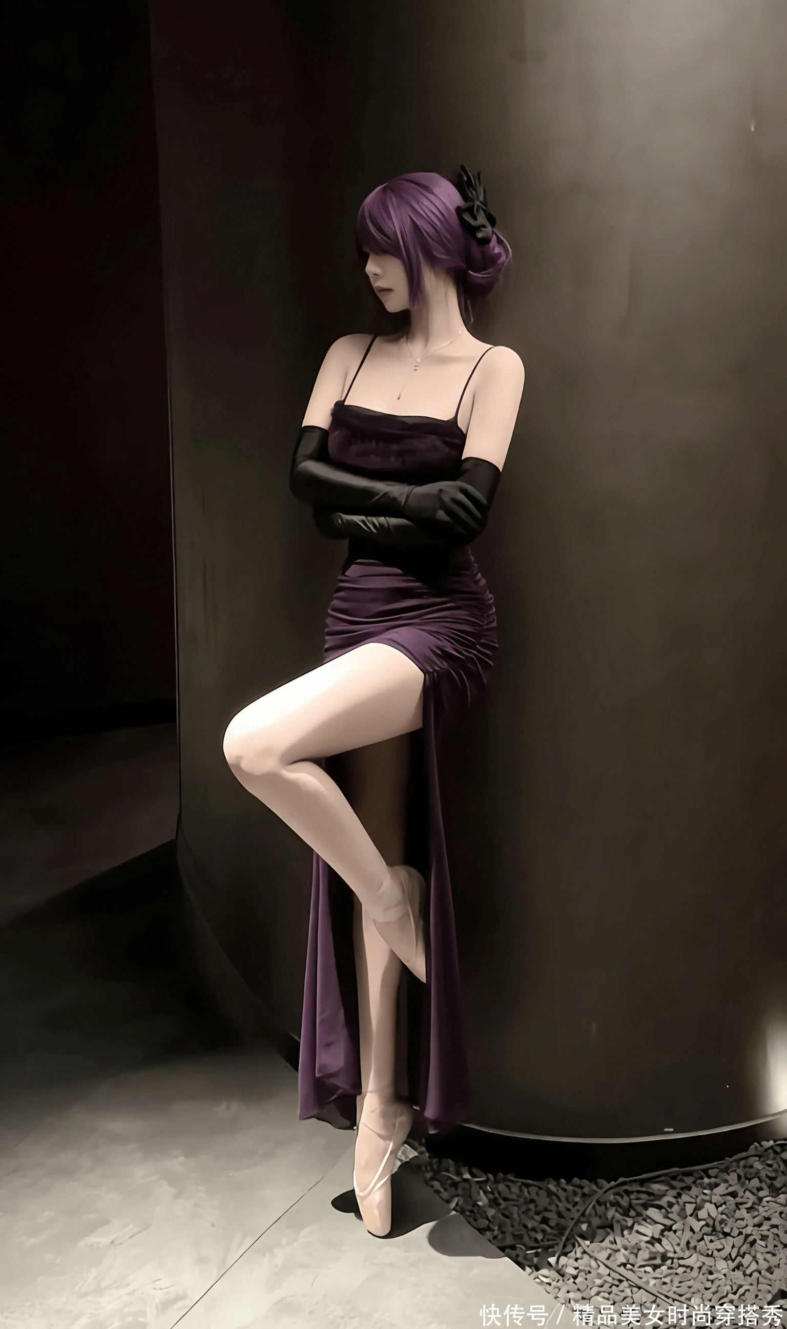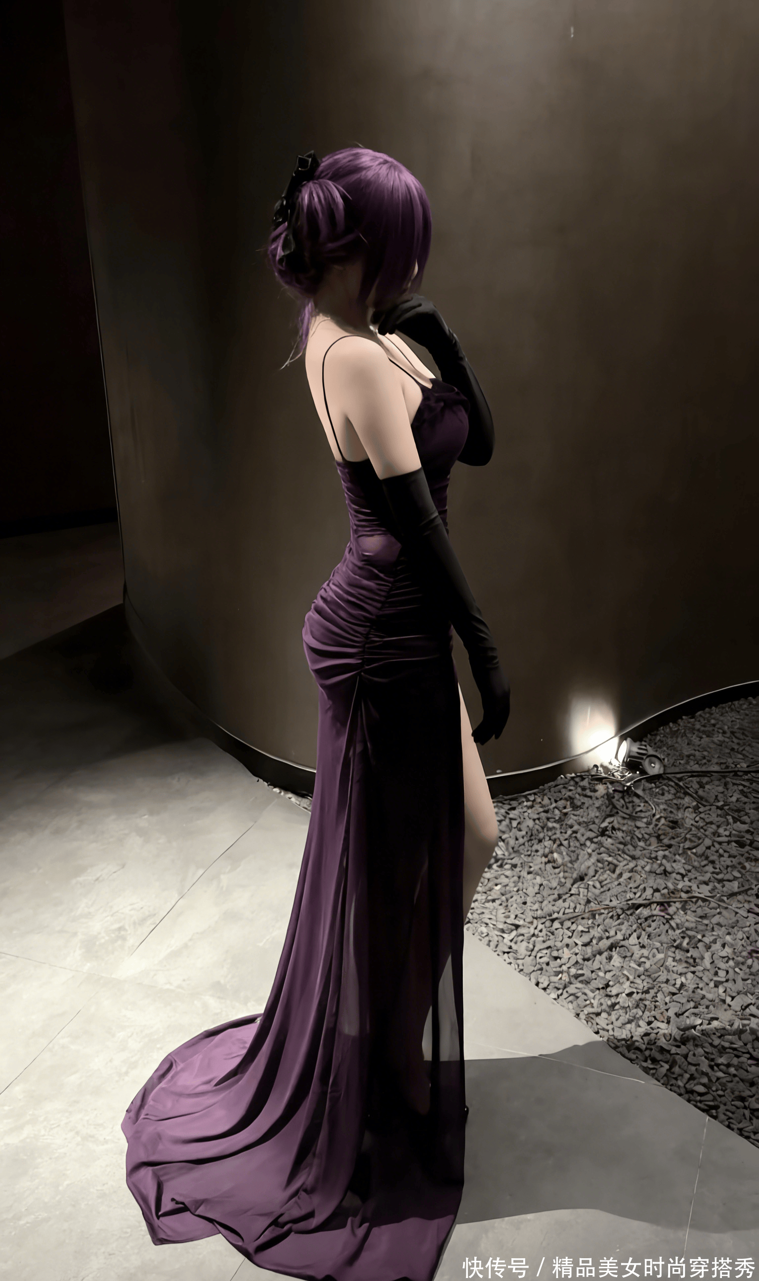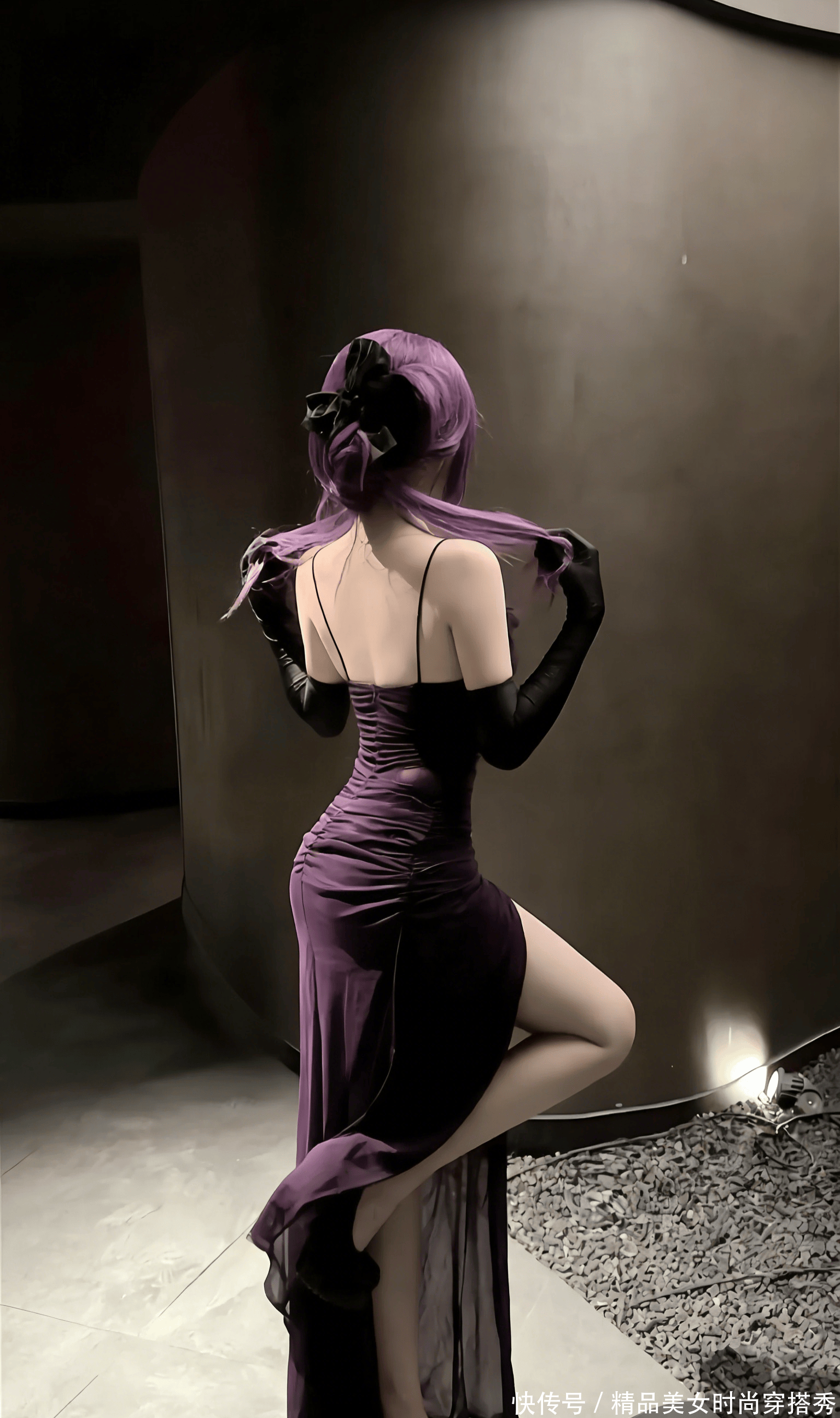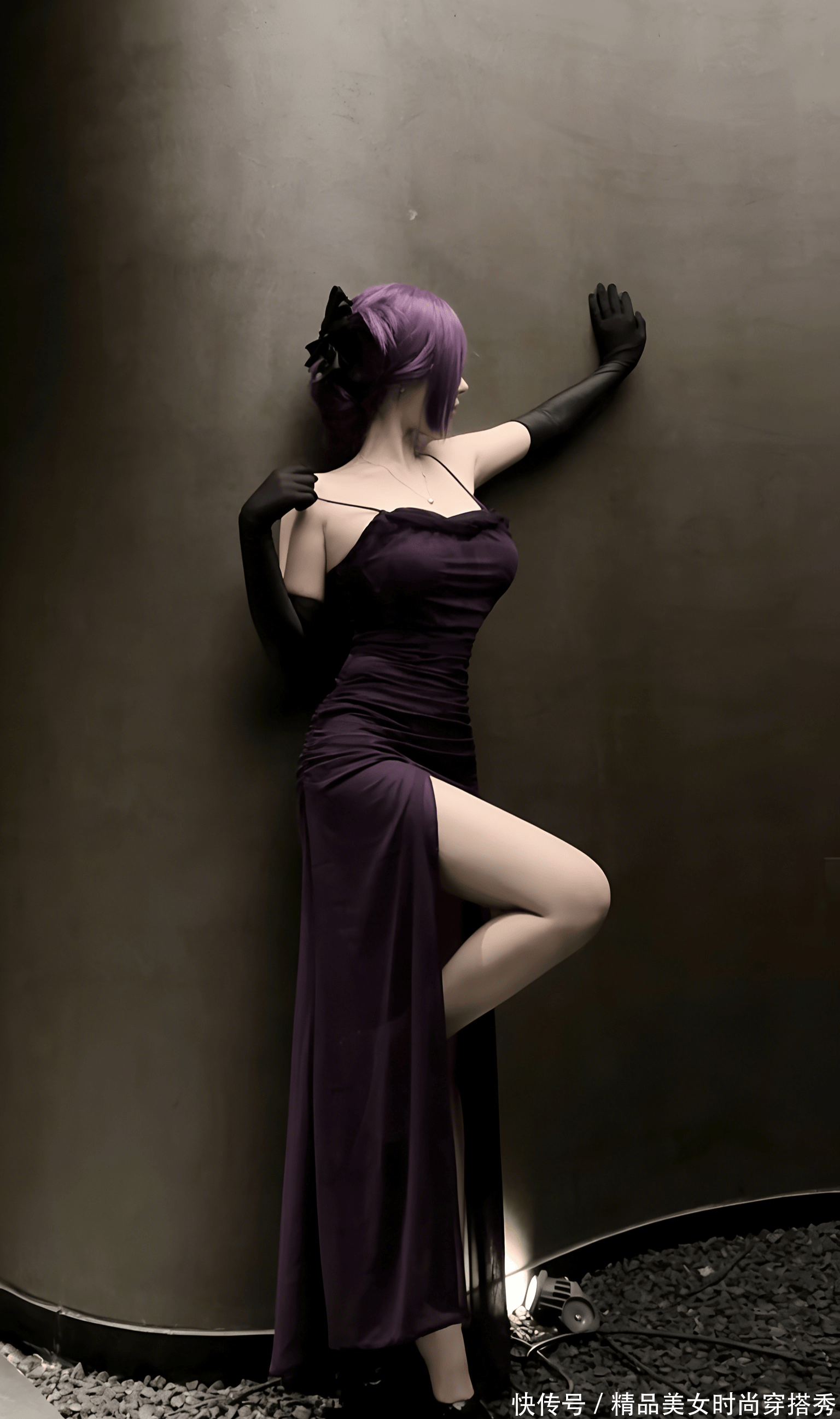 地面的冷硬与她裙摆的柔软形成了鲜明的对比,光与影在她身上交织,将每一寸曲线都勾勒得淋漓尽致。紫色的裙摆如藤蔓般蔓延在地面,像是要将看客的目光牢牢缠住,再也移不开。她没有回头,却能让人想象到她回眸时的眼神 —— 是带着魅惑的笑意,还是带着疏离的冷淡?这种未知的悬念,反而让画面更具吸引力。