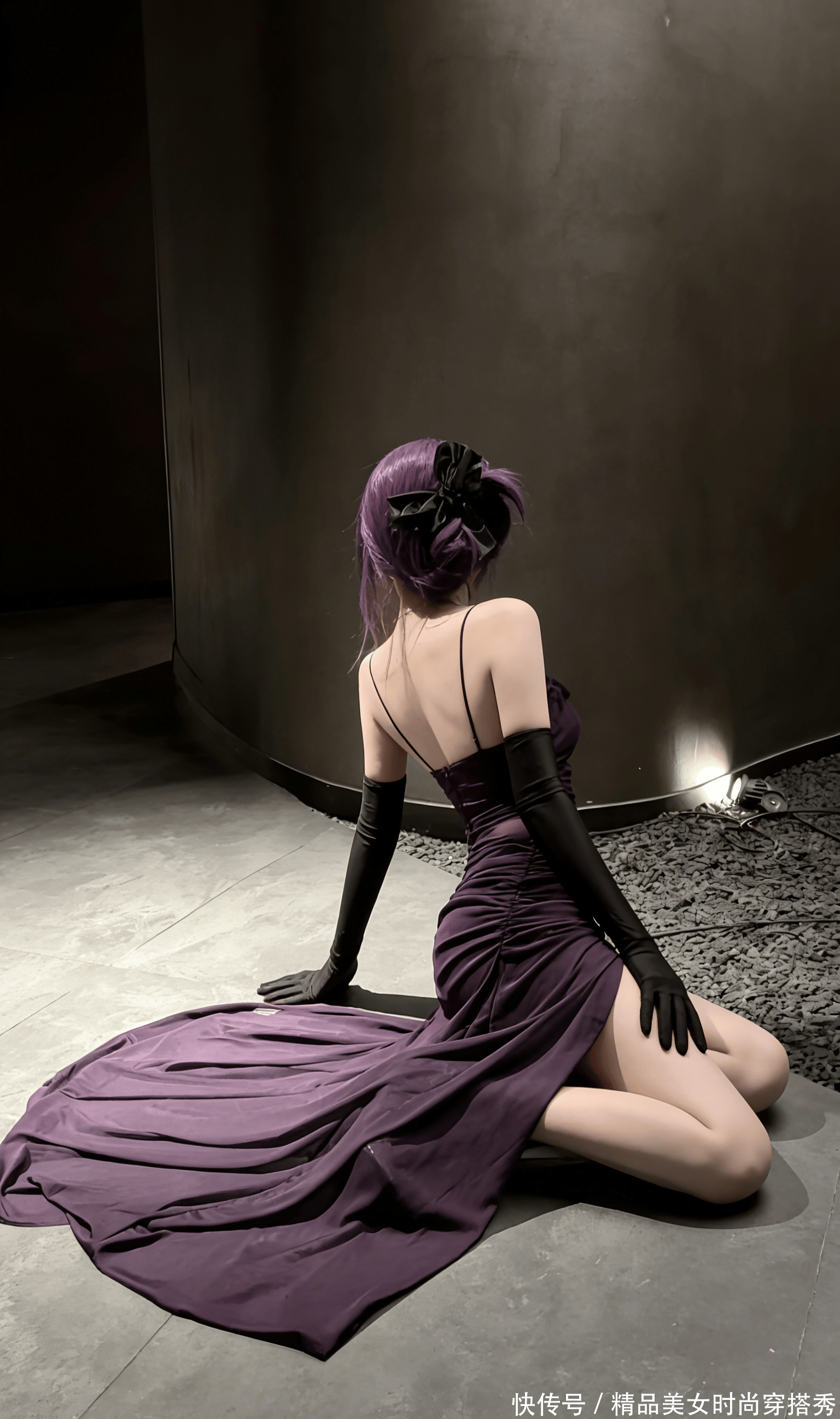 紫色的长发挽成慵懒的发髻,黑色蝴蝶结在发间若隐若现,像暗夜中停驻的蝶。长裙的材质轻薄如纱,随着她的姿态垂落出流畅的曲线,露出的肩背线条如天鹅般优雅,却在跪姿中多了几分勾人的张力。黑色长手套从指尖延伸至手肘,遮住了半臂的肌肤,反而更添了几分禁欲系的性感 —— 越是遮掩,越是让人想探寻手套下的肌肤是否如想象中细腻。