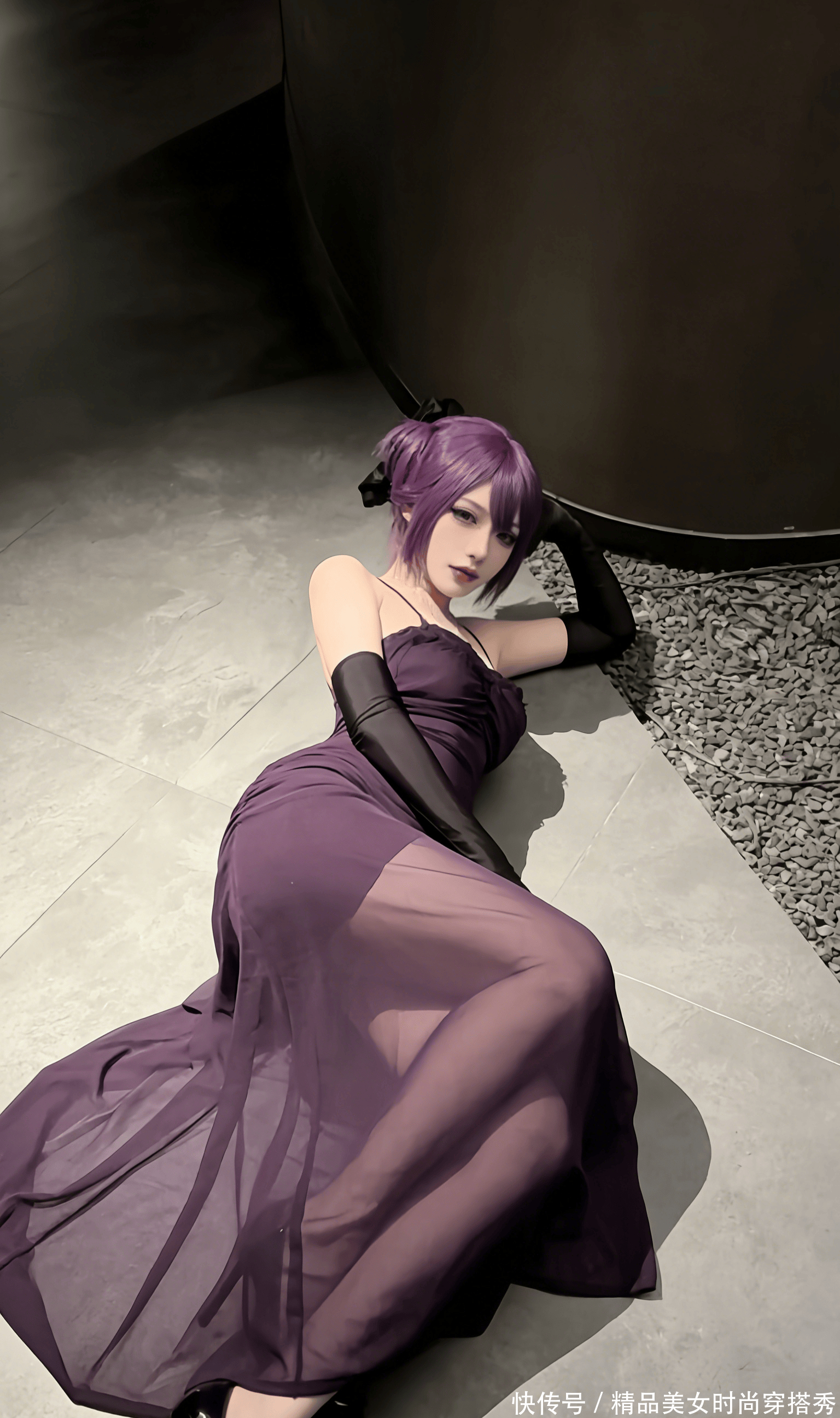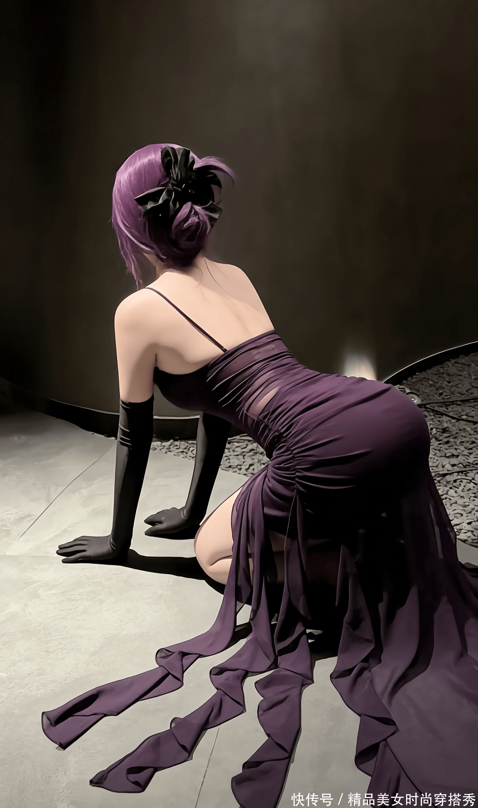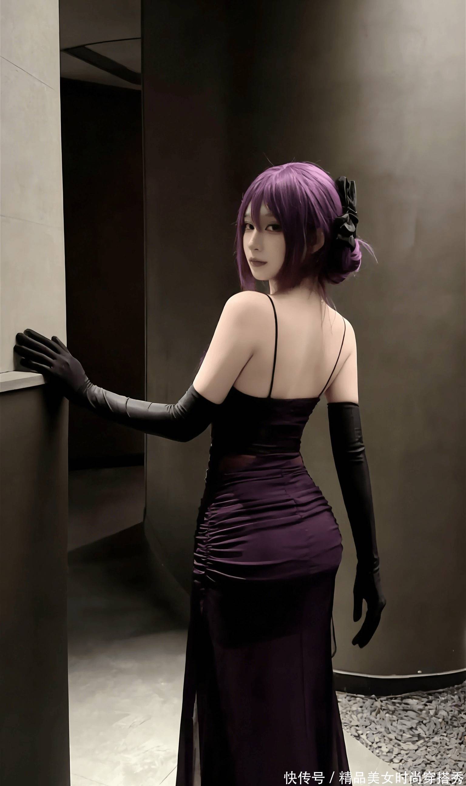镜头捕捉到的这一幕,像极了暗夜中悄然绽放的紫蔷薇 —— 紫发美人以跪姿伏于地,紫色吊带长裙如融化的葡萄汁般流淌在身侧,黑色长手套衬得肌肤胜雪,每一处褶皱都在诉说着致命的诱惑。